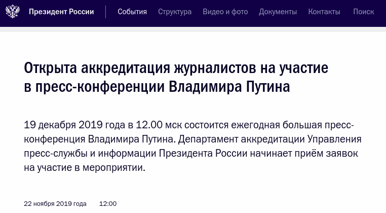 "Пресс-конференция состоится 19 декабря 2019 года", - говорится в сообщении. Таким образом, очередная большая пресс-конференция Путина пройдет через 10 дней после "нормандской" встречи.