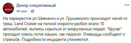 Стрельба также была. Стреляли по колесам, чтобы остановить "Крузак". Очевидцы сообщили и о пулевом отверстии на лобовом стекле автомобиля", - говорится в сообщении в соцсети.