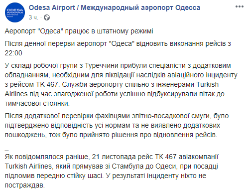 22 ноября аэропорт Одессы возобновил работу после аварийной посадки самолета Turkish Airlines рейса Стамбул-Одесса. Сообщение возобновили с 22:00. Об этом сообщается на странице одесского аэропорта в Facebook.