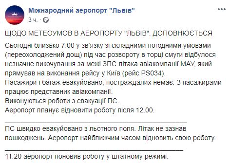 Сегодня, 23 ноября, в 11:20 аэропорт "Львов" возобновил работу в штатном режиме. Об этом сообщается на официальной странице аэропорта в Facebook.
