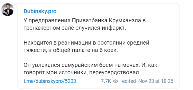 Народный депутат фракции "Слуги народа" Александр Дубинский в своем Telegram-канале написал, что у председателя правления ПриватБанка Петра Крумханзла случился инфаркт.