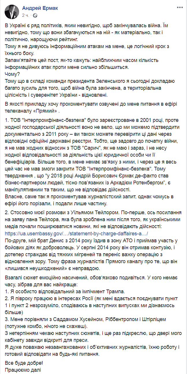 "То есть, еще задолго до начала войны, я не имел никаких отношений с ООО "Сарыч", а утверждение, что "в 2018 году Андрей Борисович Ермак де-факто стал бизнес-партнером людей, тесно связанных с Аркадием Ротенбергом", является манипулятивным и не соответствующим действительности. Собственно, именно так я прокомментировал журналистских запрос, однако почему-то в эфире его порезали, и подали только часть" - написал помощник президента.