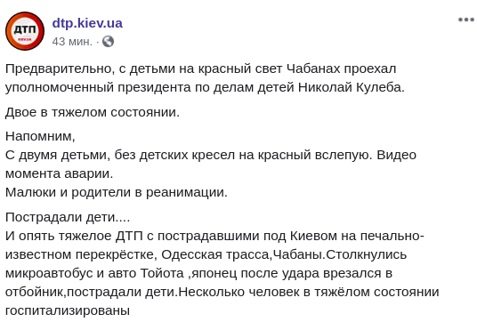 В сети появились подробности с аварией уполномоченного по правам детей Николая Кулебы и видео с места автокатастрофы. Подробности опубликовали на Facebook-странице "dtp.kiev.ua". Предварительно, с детьми на красный свет Чабанах проехал уполномоченный президента по делам детей Николай Кулеба.