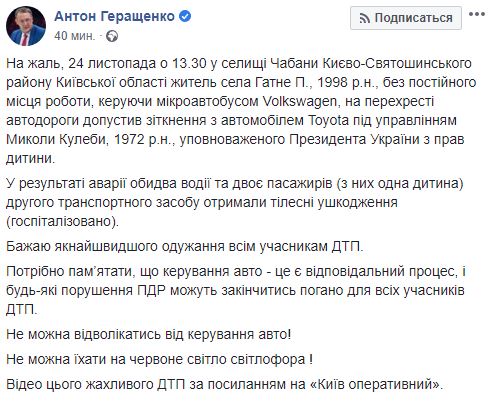 "К сожалению, 24 ноября в 13.30 в поселке Чабаны Киево-Святошинского района Киевской области житель села Гатное П., 1998 г.р., без постоянного места работы, управляя микроавтобусом Volkswagen, на перекрестке автодороги допустил столкновение с автомобилем Toyota под управлением Николая Кулебы, 1972 г.р., уполномоченного Президента Украины по правам ребенка.