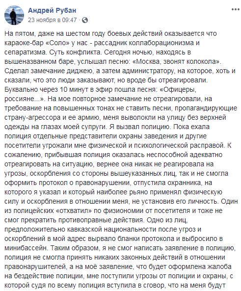 По словам Рубана, в караоке-баре, где он проводил вечер, играли песни Олега Газманова. Заместитель мэра потребовал от диджея и администрации заведения "не ставить песни, пропагандирующие страну-агрессора и ее армию".