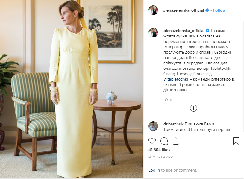 "То самое желтое платье, которое я надевала на церемонию интронизации японского императора и которое наделало шума, послужит доброму делу! Сегодня, накануне Всемирного дня соболезнования, я передаю ее как лот для благотворительного гала-ужина Tabletochki Giving Tuesday Dinner – команды супергероев, которые уже 8 лет стоят на защите деток с онко", - написала она.