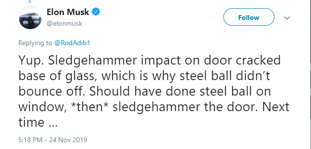 Генеральный директор компании Tesla Илон Маск объяснил, почему во время презентации его нового супурфутуристического электропикапа Cybertruck было повреждено стекло от тестовых ударов металлическим шариком. Об этом он написал на своей странице в Twitter.
