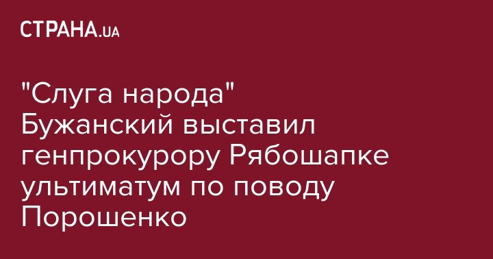 Народный депутат фракции "Слуги народа" Максим Бужанский поставил ультиматум генеральному прокурору Руслану Рябошапке. Он требует, чтобы руководитель ГПУ до четверга, 28 ноября, внес в парламент представление о снятии неприкосновенности с Петра Порошенко. Об этом Максим Бужанский сообщил в своем Telegram-канале.
