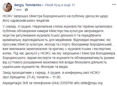 "В среду, 4 декабря, Национальный союз журналистов Украины организует публичное обсуждение намерений Министерства культуры ввести жесткое регулирование журналистской деятельности и предусмотреть уголовную ответственность для медийщиков", - написал Томиленко.