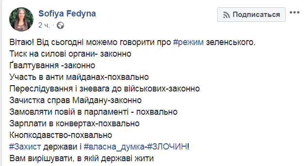 "Поздравляю! С сегодняшнего дня можем говорить о режиме Зеленского. Давление на силовые органы - законно. Насилие - законно. Участие в антимайданах - похвально. Преследования и пренебрежение к военным - законно. Зачистка дел Майдана - законна. Заказывать проституток в парламенте - похвально. Зарплаты в конвертах - похвально. Кнопкодавство - похвально", - перечислила преступления и промахи "режима" Федына.