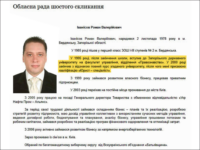 В его автобиографии было указано, что он окончил Бердянский университет менеджмента и бизнеса, факультет управления, отделение "Правоведение", квалификация "Юрист - специалист" (диплом с отличием). О Запорожском университете ни слова.