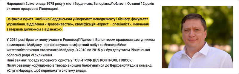 Эта же информация о депутате указана на официальном сайте "Слуги народа" и на сайте депутата на округе.