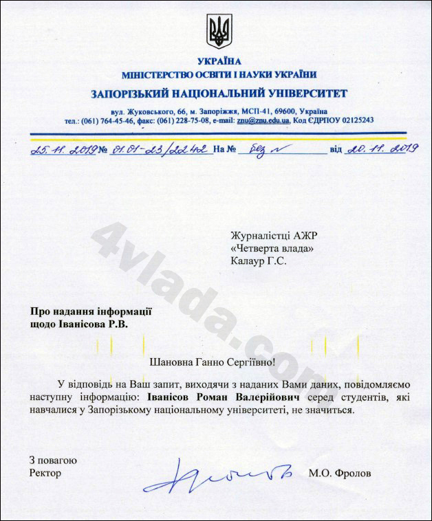 Когда появилась информация о судимости Романа Иванисов, были отправлены запросы в Запорожский национальный университет и Бердянского университета менеджмента и бизнеса.
