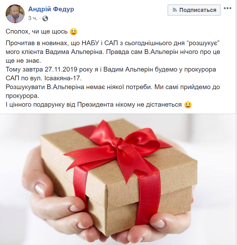 "Переполох или еще что-то. Прочитал в новостях, что НАБУ и САП с сегодняшнего дня (вторника, 26 ноября - Ред.) “разыскивает” моего клиента Вадима Альперина. Правда сам В. Альперин ничего об этом еще не знает. Поэтому завтра 27.11.2019 года я и Вадим Альперин будем у прокурора САП по улице Исаакяна-17. Разыскивать В. Альперина нет никакой надобности. Мы сами придем к прокурору. И ценного подарка от Президента никому не достанется", - заявил адвокат.
