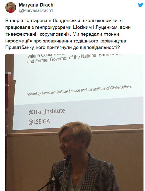Бывшая глава Национального банка Украины Валерия Гонтарева снова выступила с резкой критикой в адрес двух экс-генпрокуроров Виктора Шокина и Юрия Луценко. Во время своего выступления в Лондонской школе экономики она назвала их "неэффективными и коррумпированными".