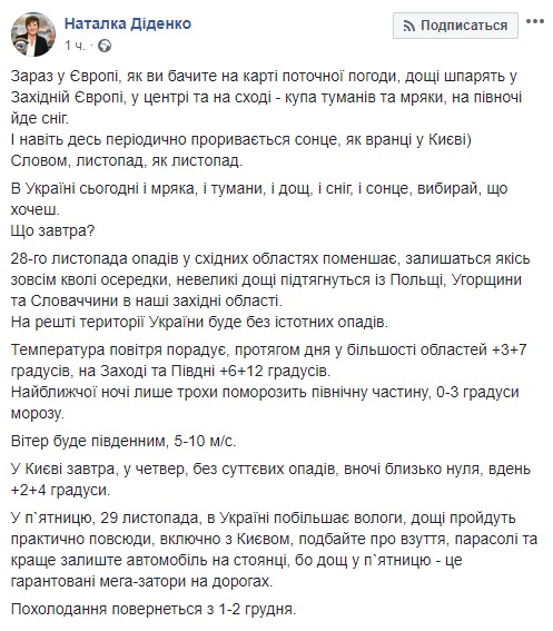 "В пятницу, 29 ноября, в Украине станет больше влаги, дожди пройдут практически повсюду, включая Киев, позаботьтесь об обуви, зонтах и лучше оставьте автомобиль на стоянке, потому что дождь в пятницу - это гарантированные мега-пробки на дорогах", - предупреждает синоптик.