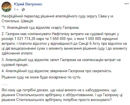 "Неофициальный перевод" решения апелляционного суда округа Свеа по первой жалобе Газпрома на решение Стокгольмского арбитража опубликовал сегодня исполнительный директор Нафтогаза Юрий Витренко на своей странице в соцсети.