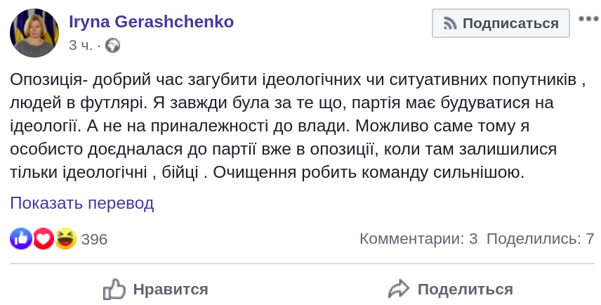 "Оппозиция - хорошее время потерять идеологических или ситуативных попутчиков, людей в футляре... Очистка делает команду сильнее" - заявила политик.