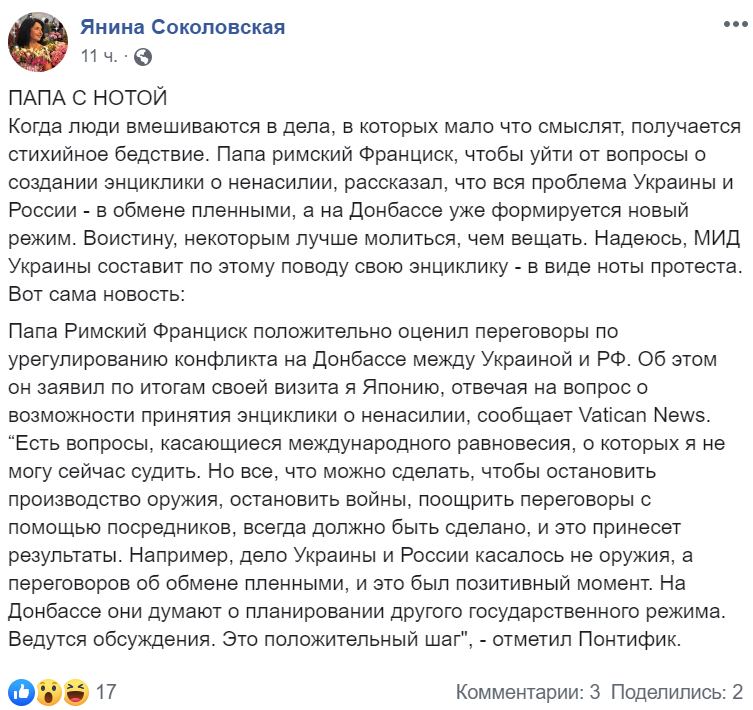 Соколовская это написала после заявления  Франциска I 26 ноября, который назвал примером успешных переговоров договоенности России и Украины по обмену пленными и по особому статусу для Донбасса.