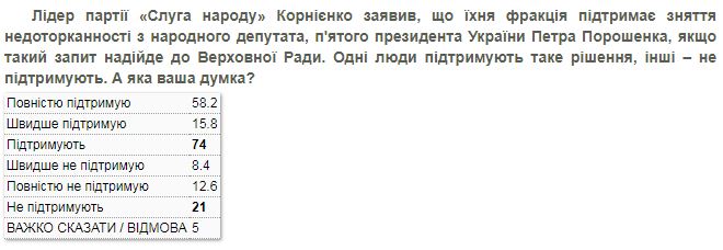 Оценивая заявление лидера партии "Слуга народа" Корниенко о том, что их фракция поддержит снятие неприкосновенности с народного депутата, пятого президента Украины Петра Порошенко, если такой запрос поступит в Верховную Раду, 74% опрошенных в той или иной степени поддержали это решение; 21% - не поддержали.