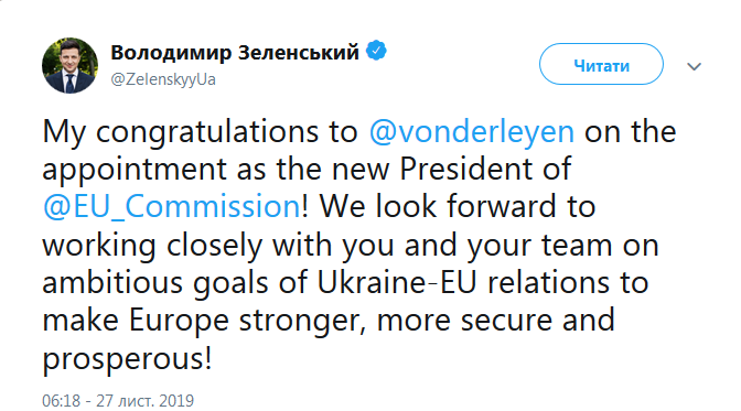 "Поздравляю Урсулу фон дер Ляйен с назначением новым главой Европейской комиссии! Мы рассчитываем на тесное сотрудничество с вами и вашей командой в достижении амбициозных целей в отношениях "Украина-ЕС, что бы сделать Европу более сильной, безопасной и процветающей!", - написал глава государства.