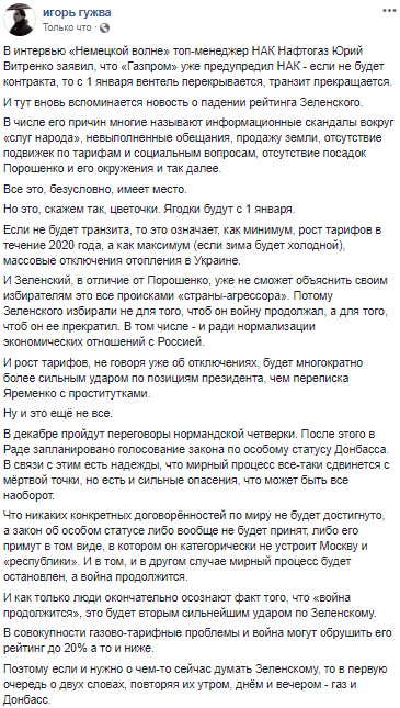 Если не будет транзита, то это означает, как минимум, рост тарифов в течение 2020 года, а как максимум (если зима будет холодной), массовые отключения отопления в Украине.