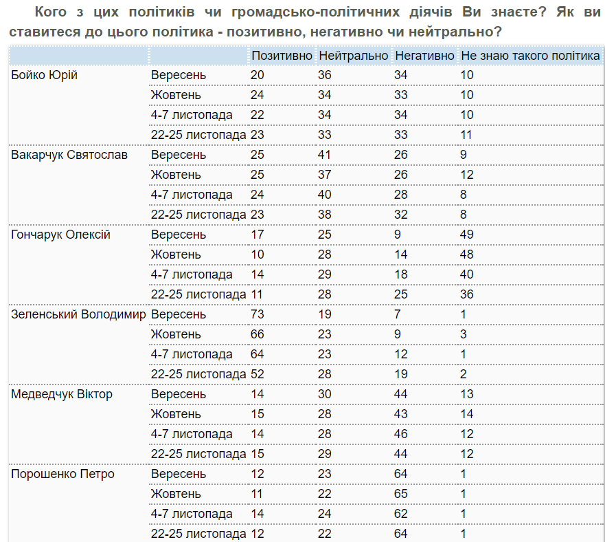 Теперь перейдем к властной команде. Там - сплошное проседание. Премьер Алексей Гончарук потерял 6% позитивного отношения, а спикер парламента Дмитрий Разумков - сразу 9%.