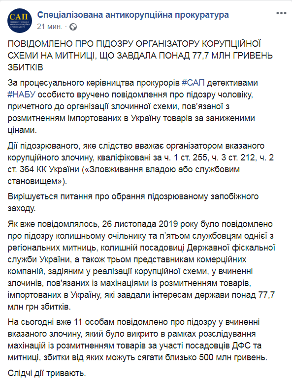 Реализуя коррупционную схему с растаможкой товаров, импортируемых в Украину, злоумышленники нанесли государству ущерб в размере более 77,7 млн грн.