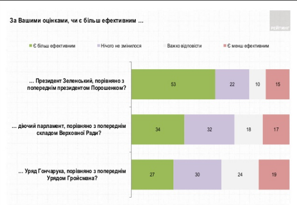 Согласно данным опроса, лишь 27% людей убеждены в большей эффективности действующего правительства Гончарука по сравнению с Кабмином Владимира Гройсмана.