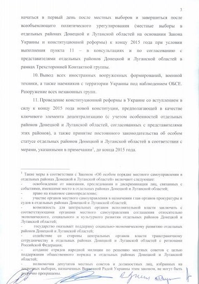 11) проведение конституционной реформы в Украине, которая предполагает децентрализацию Донецкой и Луганской областей; принятие постоянного закона об особом статусе этих территорий,