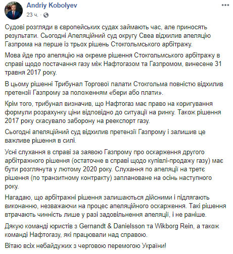 Коболев поблагодарил команды юристов из Gernandt & Danielsson, Wikborg Rein и "Нафтогаза", которые работают над делом.