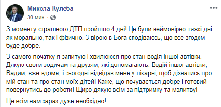 "С самого начала я спрашиваю и волнуюсь о состоянии водителя другой машины. Спасибо моим родственникам и друзьям, которые помогают. Водитель другого автомобиля, Вадим, уже дома, и сегодня посетил меня в больнице, чтобы узнать о моем состоянии и о состоянии моих детей! Говорит, что чувствует себя хорошо и готов вернуться к работе! Спасибо всем за поддержку и молитву!" - написал Кулеба.