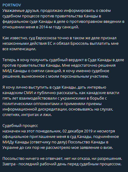 "Как известно, суд Евросоюза точно в таком же деле признал незаконными действия ЕС и обязал Брюссель выплатить мне все компенсации. Теперь я хочу получить судебный вердикт в Суде Канады в деле против правительства Канады. Мне недостаточно решения МИД Канады о снятии санкций, я хочу именно судебное решение, вынесенное с моим персональным участием", - написал Портнов.