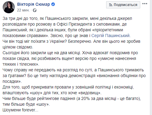 13:25 Виктория Сюмар, которая хотела взять экс-нардепа на поруки, назвала это решение "шоу для тех, кто хочет зрелищ".