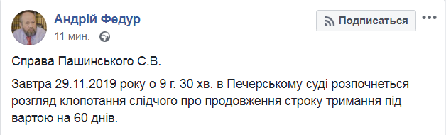 7 октября Печерский суд избрал Пашинскому меру пресечения - заключение под стражей до 4 декабря 2019 года без возможности внесения залога. Сегодня суд должен решить, оставить ли старую меру в силе или изменить ее.