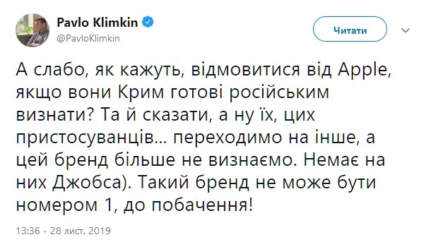 "А слабо, как говорят, отказаться от Apple, если они Крым готовы признать российским? Да и сказать, а ну их, этих приспособленцев... переходим на другое, а этот бренд больше не признаем. Нет на них Джобса). Такой бренд не может быть номером 1, до свидания!", - написал Климкин.