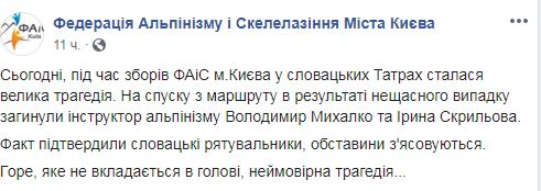 Как сообщается на странице Федерации альпинизма и скалолазания города Киева в Facebook, несчастный случай произошел на спуске с горы Видлова башня (высота - 2522 метра) в словацких Татрах (часть Карпат).