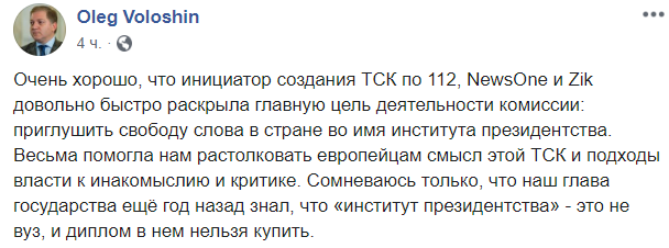 "Очень хорошо, что инициатор создания ТСК по 112, NewsOne и Zik довольно быстро раскрыла главную цель деятельности комиссии: приглушить свободу слова в стране во имя института президентства. Весьма помогла нам растолковать европейцам смысл этой ТСК и подходы власти к инакомыслию и критике. Сомневаюсь только, что наш глава государства ещё год назад знал, что "институт президентства" - это не вуз, и диплом в нем нельзя купить", - пишет в Facebook нардеп Олег Волошин.