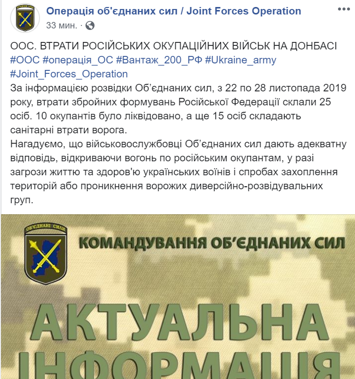 С 22 по 28 ноября 2019 года потери незаконных вооруженных формирований в зоне ООС составили 25 человек. Об этом говорится на фб-странице пресс-службы штаба ООС.