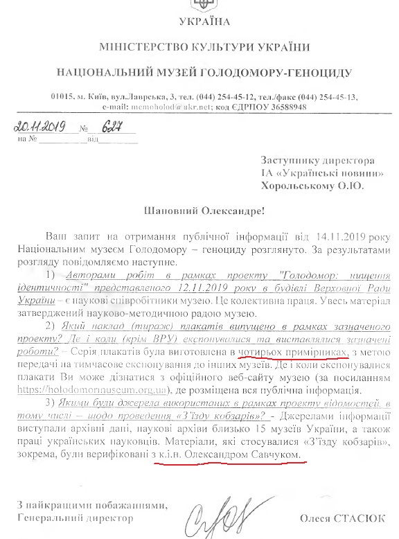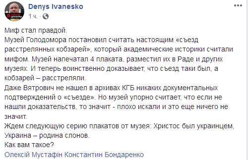 "Миф стал правдой. Музей Голодомора постановил считать настоящим "съезд расстрелянных кобзарей", который академические историки считали мифом. Музей напечатал 4 плаката, разместил их в Раде и других музеях. И теперь воинственно доказывает, что съезд таки был, а кобзарей – расстреляли", - сказал он.
