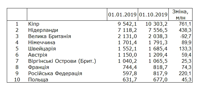 Так, Кипр инвестировал в экономику Украины 761 млн долларов, Нидерланды – 438 млн долларов, Россия – 220 млн долларов. Дальше по списку идут Швейцария (133 млн долларов) и Германия (89,9 млн долларов).