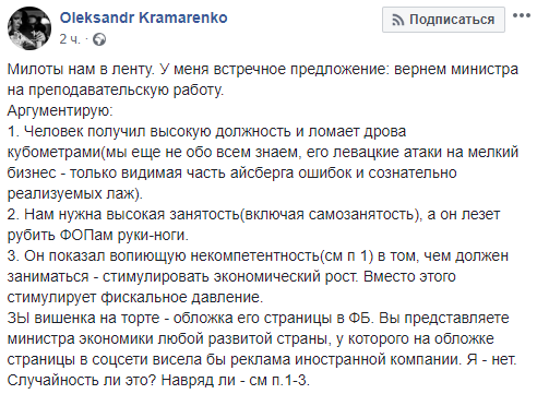ЗЫ вишенка на торте - обложка его страницы в ФБ. Вы представляете министра экономики любой развитой страны, у которого на обложке страницы в соцсети висела бы реклама иностранной компании. Я - нет. Случайность ли это? Навряд ли - см п.1-3" - написал журналист Александр Крамаренко.