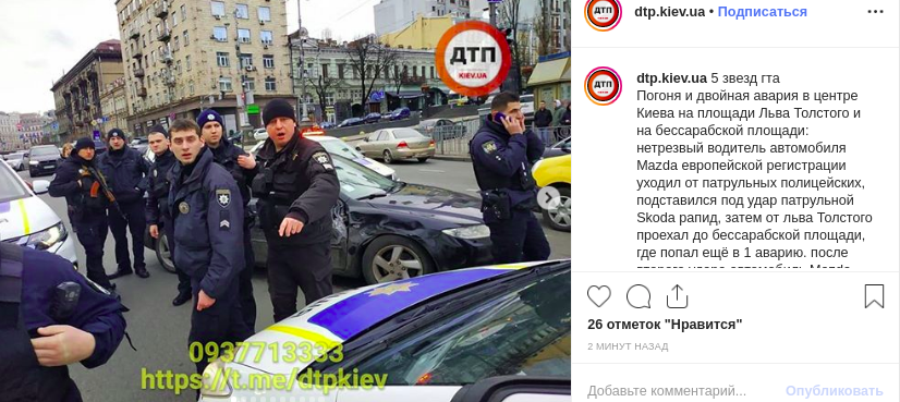 Нетрезвый водитель автомобиля Mazda на европейских номерах уходил от патрульных полицейских, подставился под удар патрульной Skoda, а затем от площади Льва Толстого проехал до Бессарабской площади, где попал ещё в одну аварию.