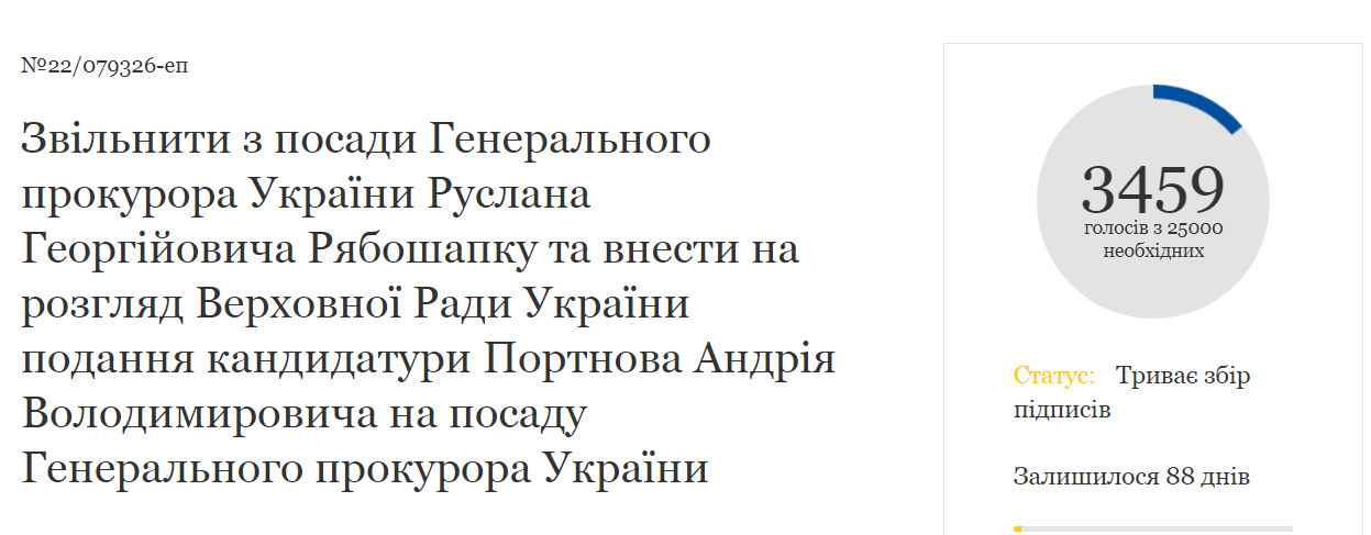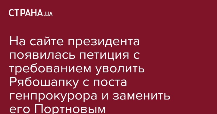На официальном сайте президента Украины появилась петиция с призывом освободить от должности генерального прокурора Руслана Рябошапку и внести на рассмотрение Верховной Рады кандидатуру Андрея Портнова.