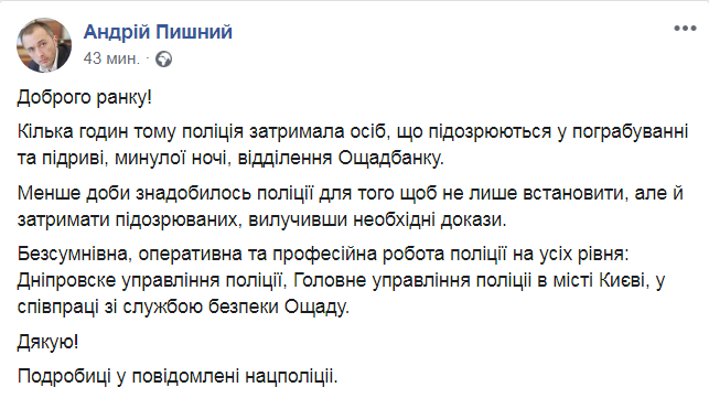 Утром 1 декабря сотрудники полиции задержали лиц, подозреваемых в подрыве банкомата и ограблении отделения "Ощадбанка" в Киеве. Об этом написал на Facebook глава правления банка Андрей Пышный.