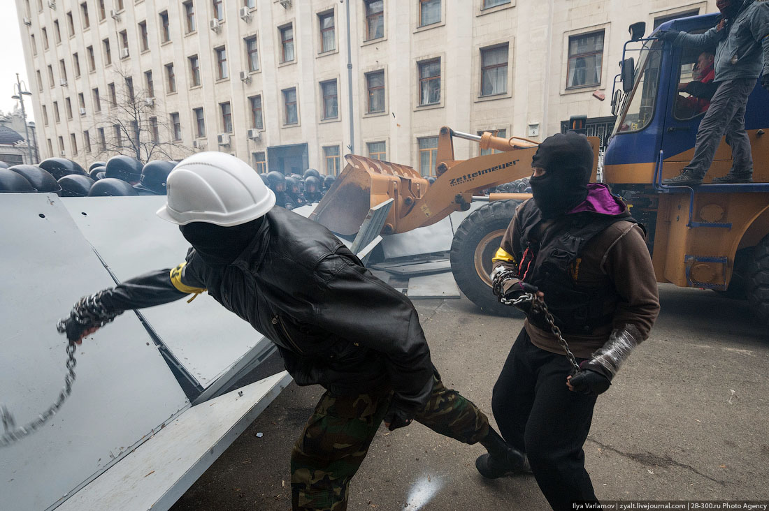 В качестве тарана перед собой они выдвинули автопогрузчик. Им управляли скандальный активист "Дорожного контроля" Андрей Дзиндзя и будущий автомайдановец Сергей Хаджинов. Погрузчик они пригнали с Майдана, где он был брошен коммунальщиками у недавно установленной новогодней елки.