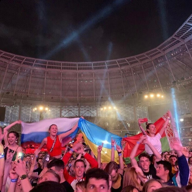 Отметим, что на концертах Макса Коржа часто появляются такие примиренческие мотивы. Недавно в Москве фанаты певца подняли рядом три флага: Украины, России и Беларуси.