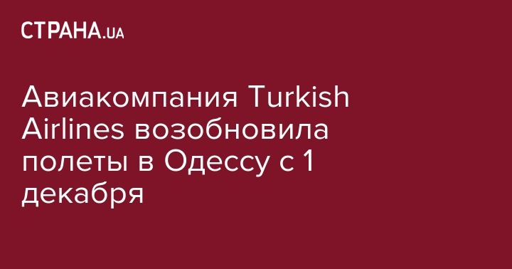 Турецкая авиакомпания Turkish Airlines, временно прекратившая полеты в Южную Пальмиру с 21 ноября, возобновила рейсы "Стамбул - Одесса" с воскресеннья, 1 декабря. Об этом сообщают "Украинские новости" со ссылкой на представителя международного аэропорта "Одесса".