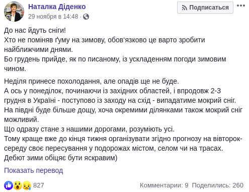 Синоптик Наталья Диденко предупредила украинцев о том, что на этой неделе в страну придет снег. Она написала прогноз погоды на ближайшие дни на своей странице в Facebook.