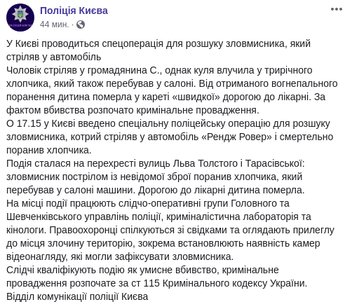 "Мужчина стрелял в гражданина С., однако пуля попала в трехлетнего мальчика, который также находился в салоне. От полученного огнестрельного ранения ребенок умер в карете "скорой" по дороге в больницу. По факту убийства начато уголовное производство" - сообщили в пресс-службе полиции.